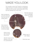 - CAP DESIGN: Temple-To-Temple Lace Front, Monofilament Part, Hand-tied Base, Velvet-Lined Ear Tabs, Velvet-Lined Extended Nape