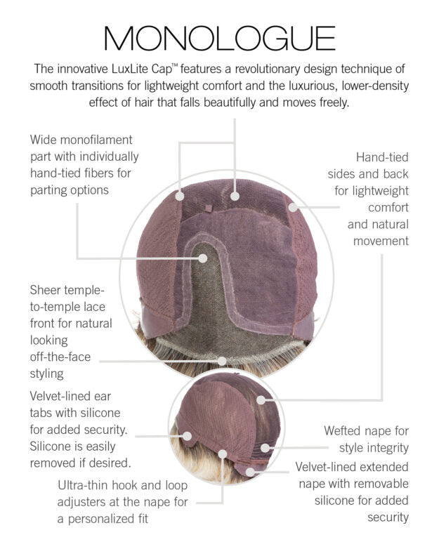 - CAP DESIGN: Temple-To-Temple Lace Front, Monofilament Top, Hand-tied Base, Velvet-Lined Ear Tabs, Velvet-Lined Extended Nape